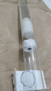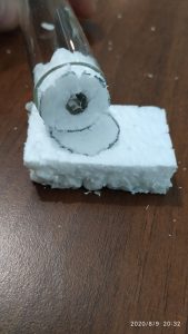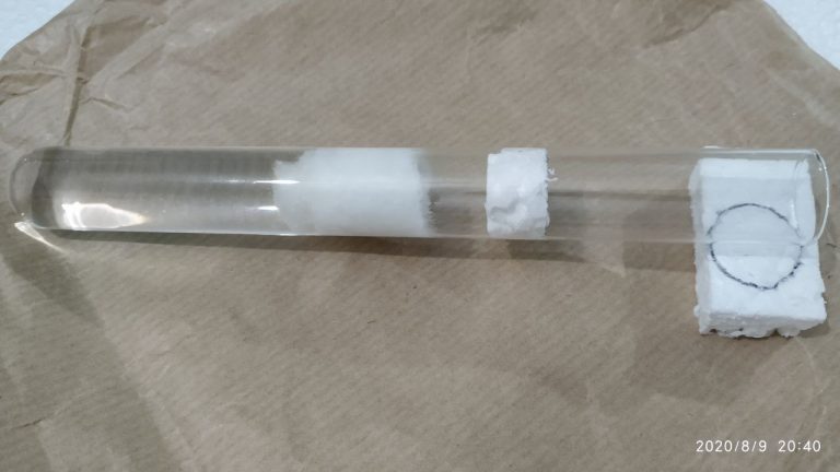 – Fatto questo trasferire la colonia se non lo si è fatto prima e spingere il cotone di chiusura in fondo fino a toccare il polistirolo, in modo che la colonia abbia come spazio abitabile solo la  camera più interna della provetta.